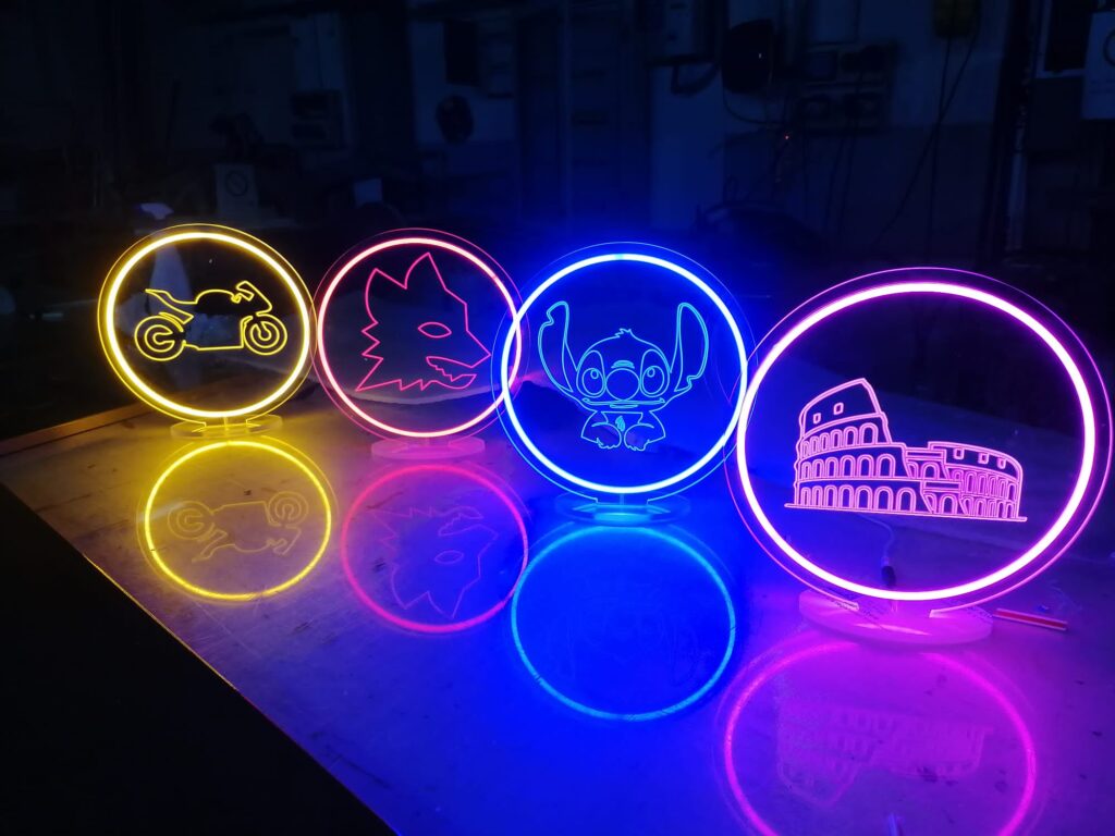 Insegne realizzate con tubo LED multicolore fissato su fondo di plexiglass, PVC o alluminio. Con il tubo LED è possibile creare parole o forme e dare molta luce e colore, risparmiando anche sulle bollette della luce, grazie al ridotto consumo energetico del LED.
