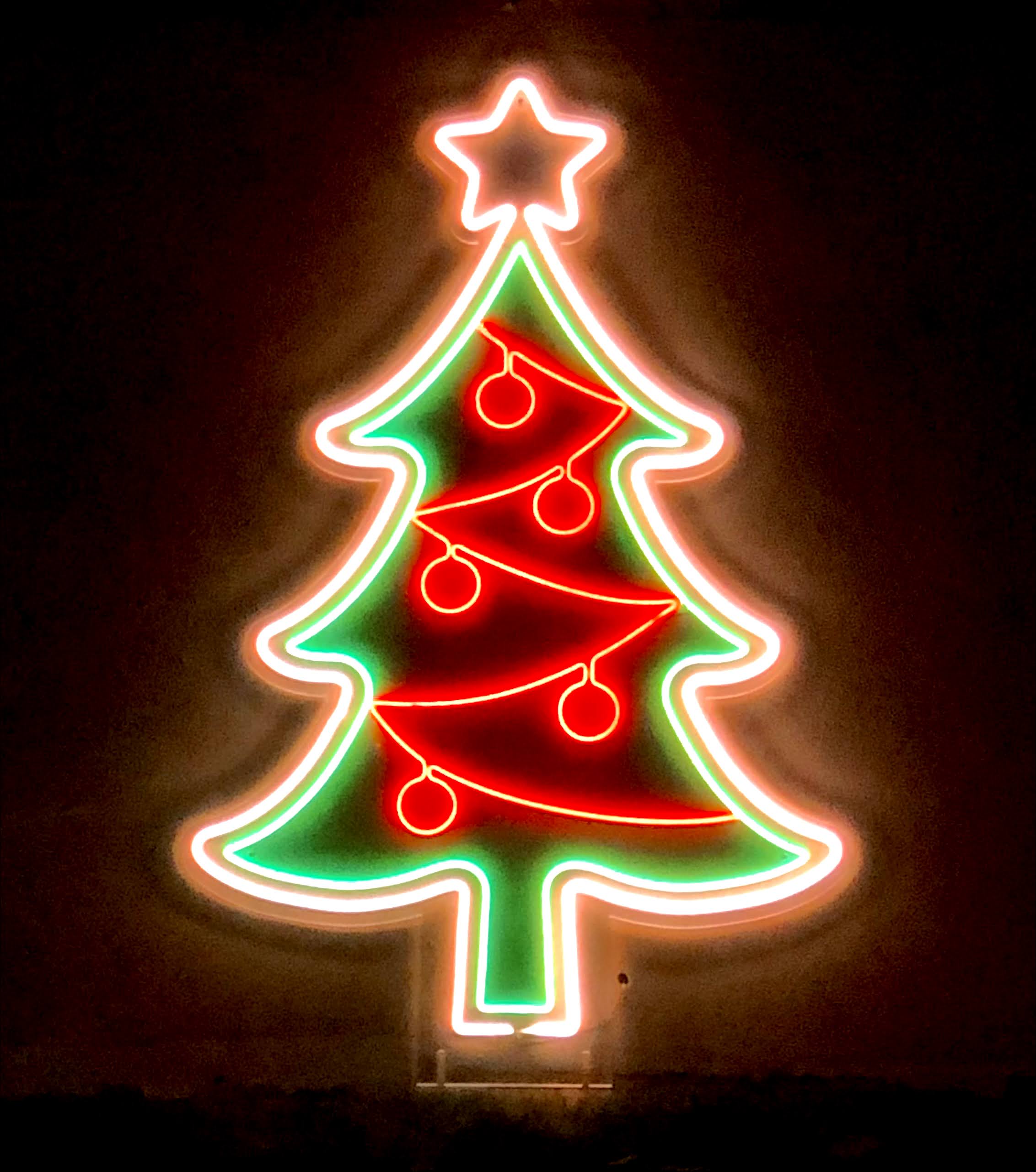 Albero di Natale luminoso realizzato con tubo LED colorato, montato su pannello sagomato in plexiglas trasparente.