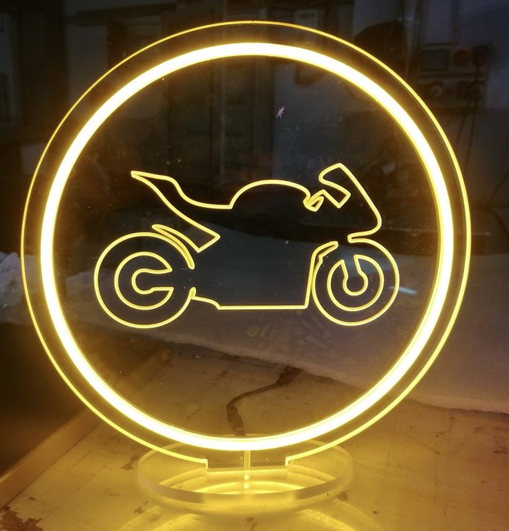 Scritte luminose personalizzate realizzate con tubo LED FLEX colorato, montate su base sagomata (plexiglas trasparente o Forex bianco/nero).
